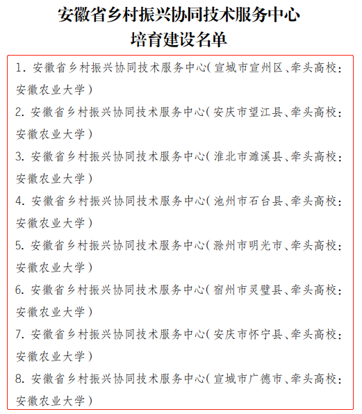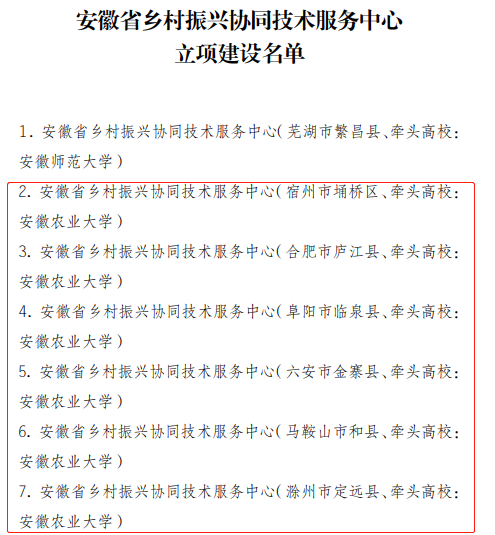 本网讯 近日,安徽省教育厅和安徽省农业农村厅联合下发了《关于安徽省乡村振兴协同技术服务中心建设立项的通知》,全省共建设34项(立项建设15项,培养建设19项)。我校新农村发展研究院、相关学院与县(区)政府、参与高校积极联合申报,成功获批建设14项(其中6项为立项建设,8项为培养建设),立项数和资助经费均在省属高校中位列第一。