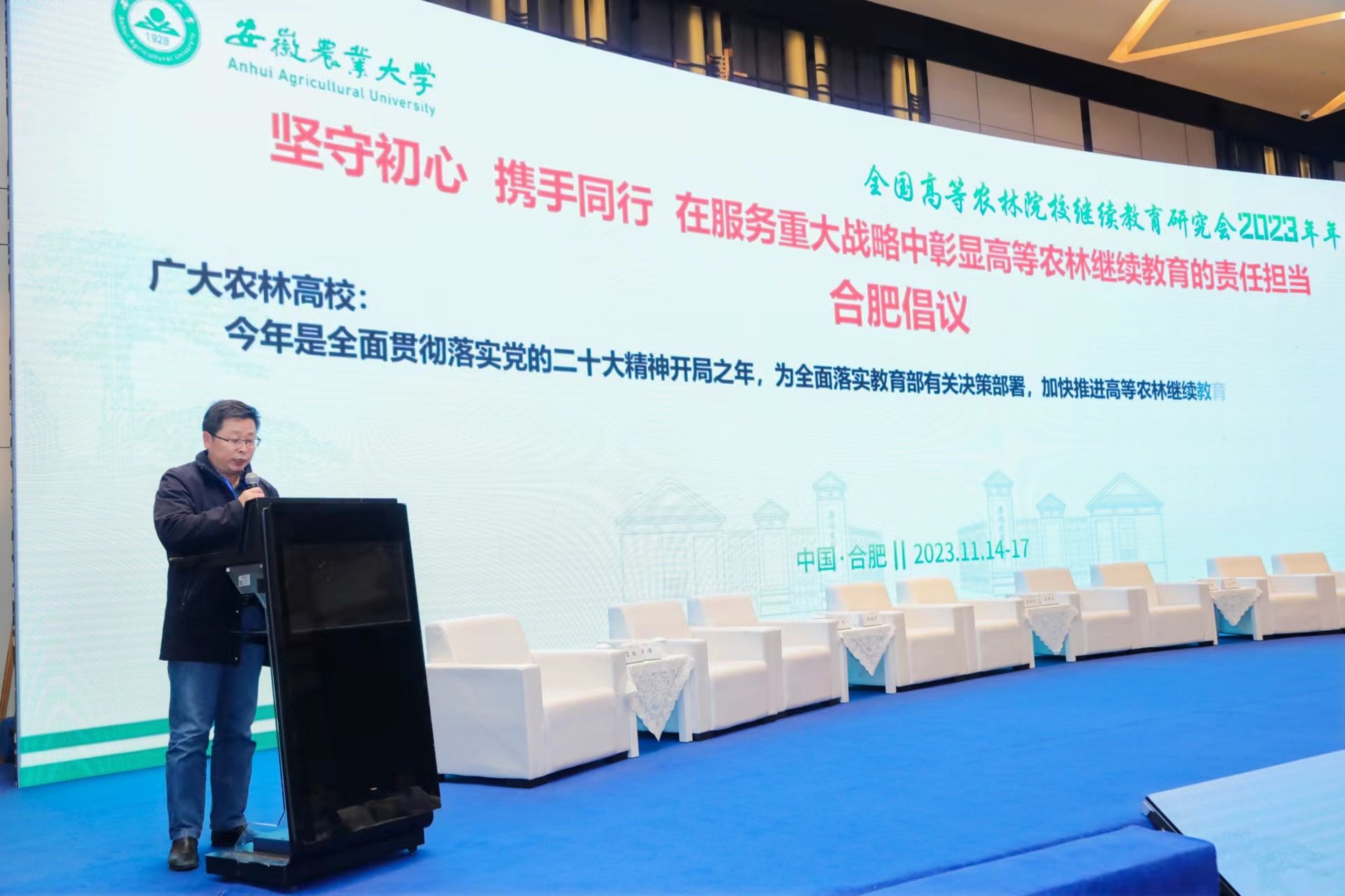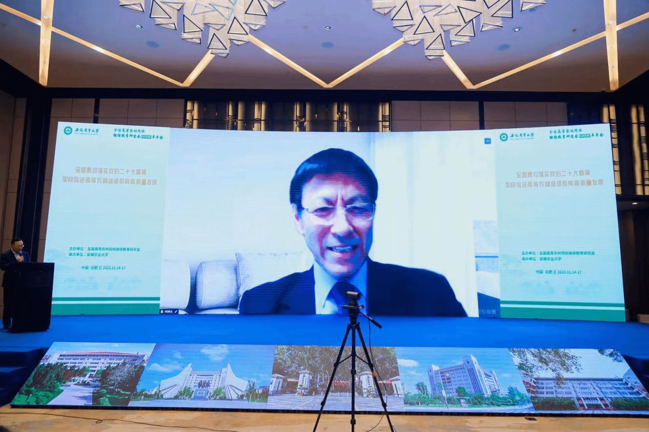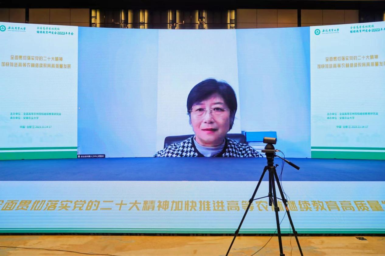 本网讯 11月15日,全国高等农林院校继续教育研究会2023年年会在安徽合肥召开,会议主题为“全面贯彻落实党的二十大精神,加快推进高等农林继续教育高质量发展”。中国农业大学党委常委、副校长林万龙代表研究会理事单位致辞,校党委常委、副校长李红代表承办单位致辞。中国农业大学原校长柯炳生教授应邀作题为“人才与科技助力建设农业强国”的主旨报告,农业农村部人力资源开发中心、中国农学会教育培训处处长韩津琳,教育部职成司高等继续教育处副处长徐璐线上参会并发表讲话。校党委常委、副校长操海群主持开幕式。省教育厅高教处和省农业农村厅人事处相关负责同志、媒体代表以及中国农业大学等43所高等农林院校继续教育学院专家领导与继续教育工作者共160人参会。