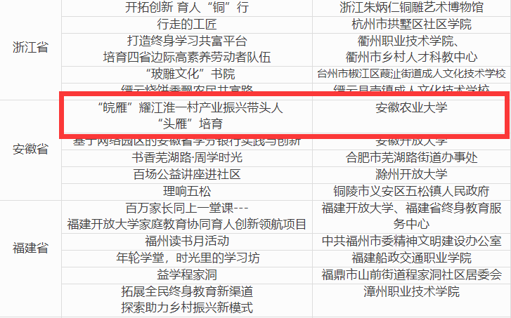 我校 “‘皖雁’耀江淮——乡村产业振兴带头人‘头雁’培育”项目继日前获评2024年安徽省“终身学习品牌项目”后,此次再获殊荣,极大地激发了“头雁”队伍加快推进农业农村现代化、打造乡村振兴安徽样板的信心与决心。“头雁”团队将进一步提升工作目标,提高学习质量,充分发挥“终身学习品牌项目”的示范引领作用。(文/图/编辑 顾坚 预审/王安源 审核/张晓伟)