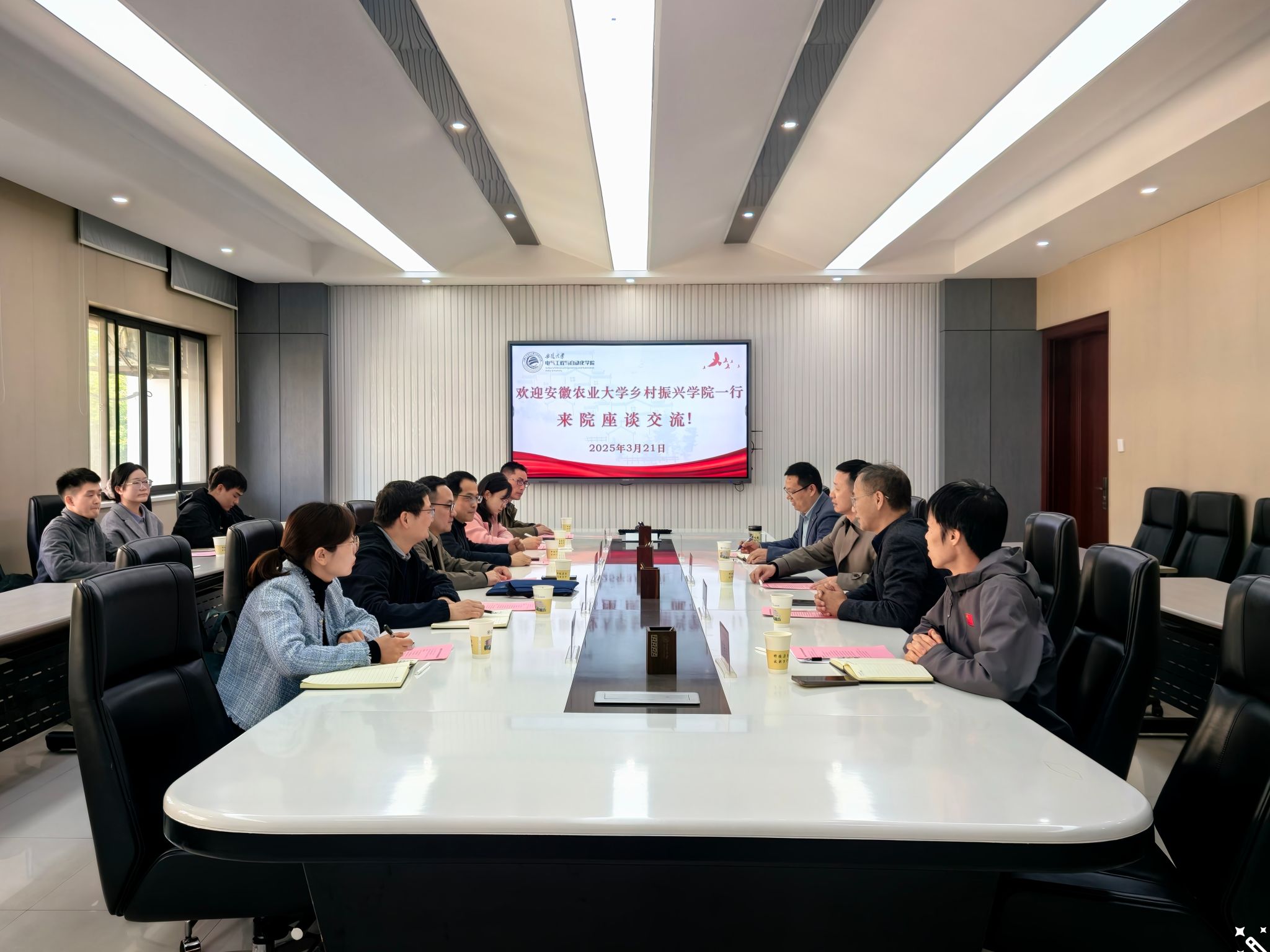 为加强对外交流与合作,促进我院党团和学科建设,3月21日上午,乡村振兴学院党总支书记张晓伟、副院长徐峰、继续教育学院副院长李玮以及相关师生一行赴安徽大学电气工程与自动化学院调研交流。安徽大学电气工程与自动化学院党委书记毕涛、副院长潘天红、副书记杨海峰、副院长陆思良参加座谈。会议由安徽大学电气工程与自动化学院党委书记毕涛主持。