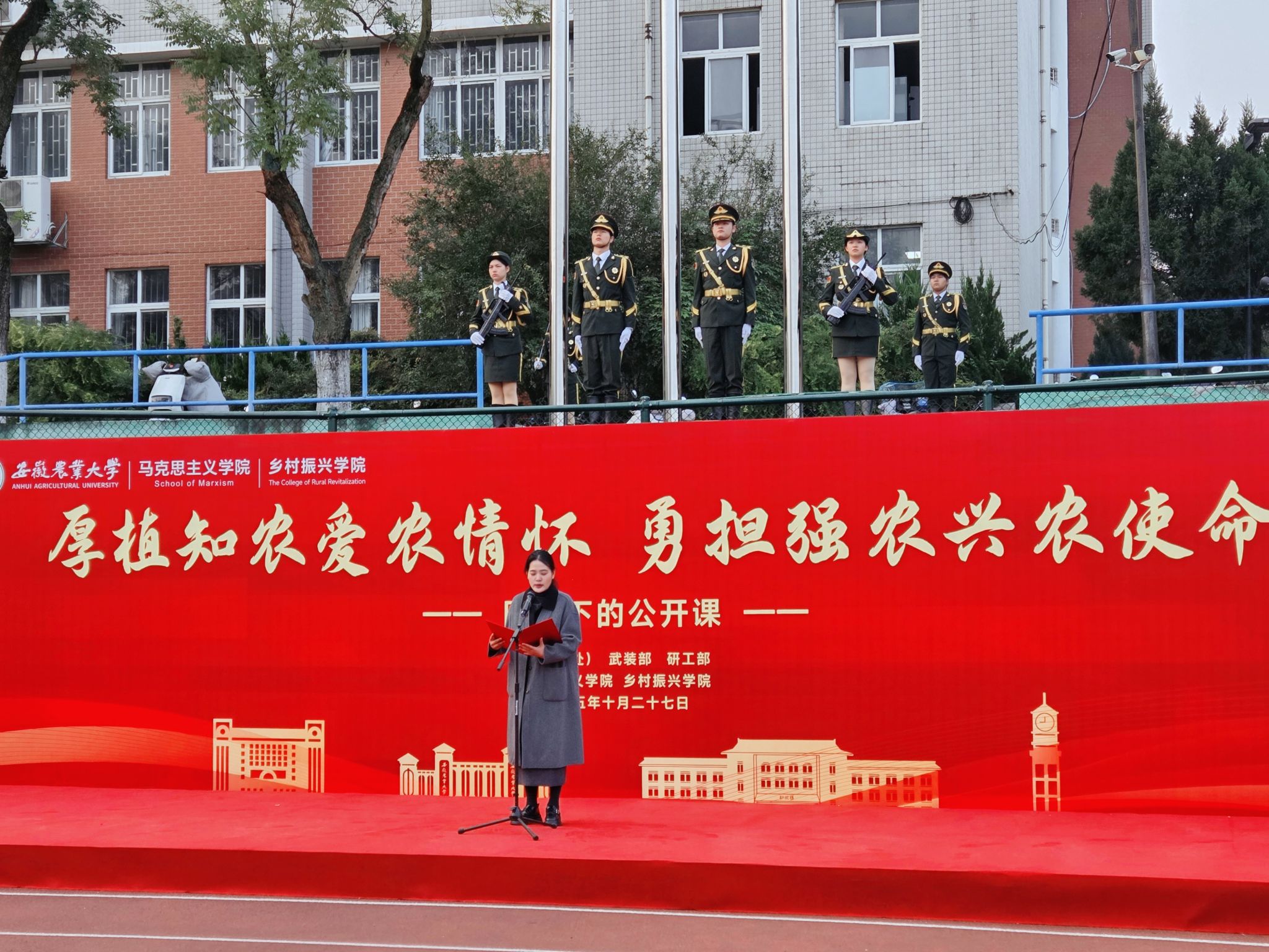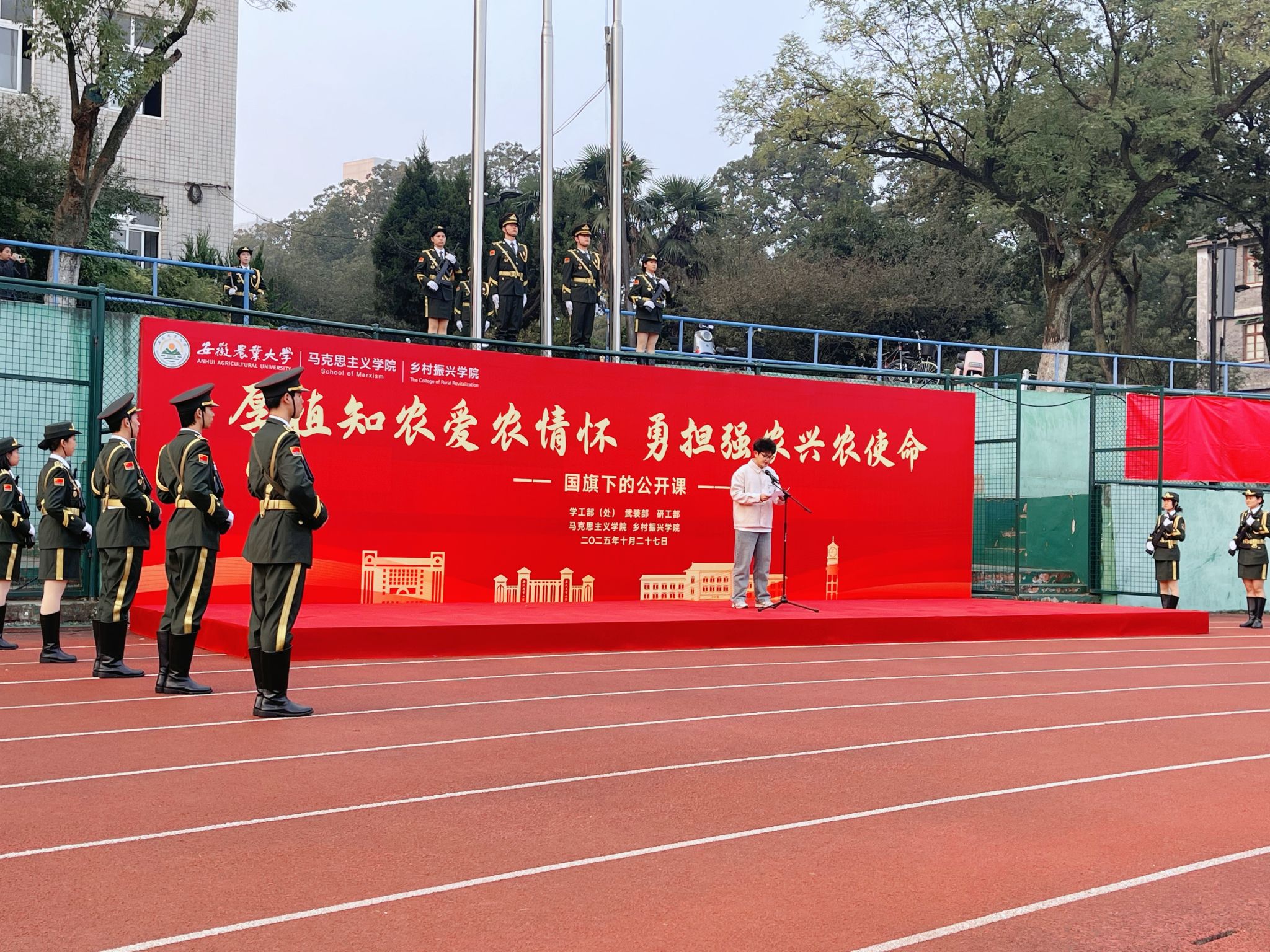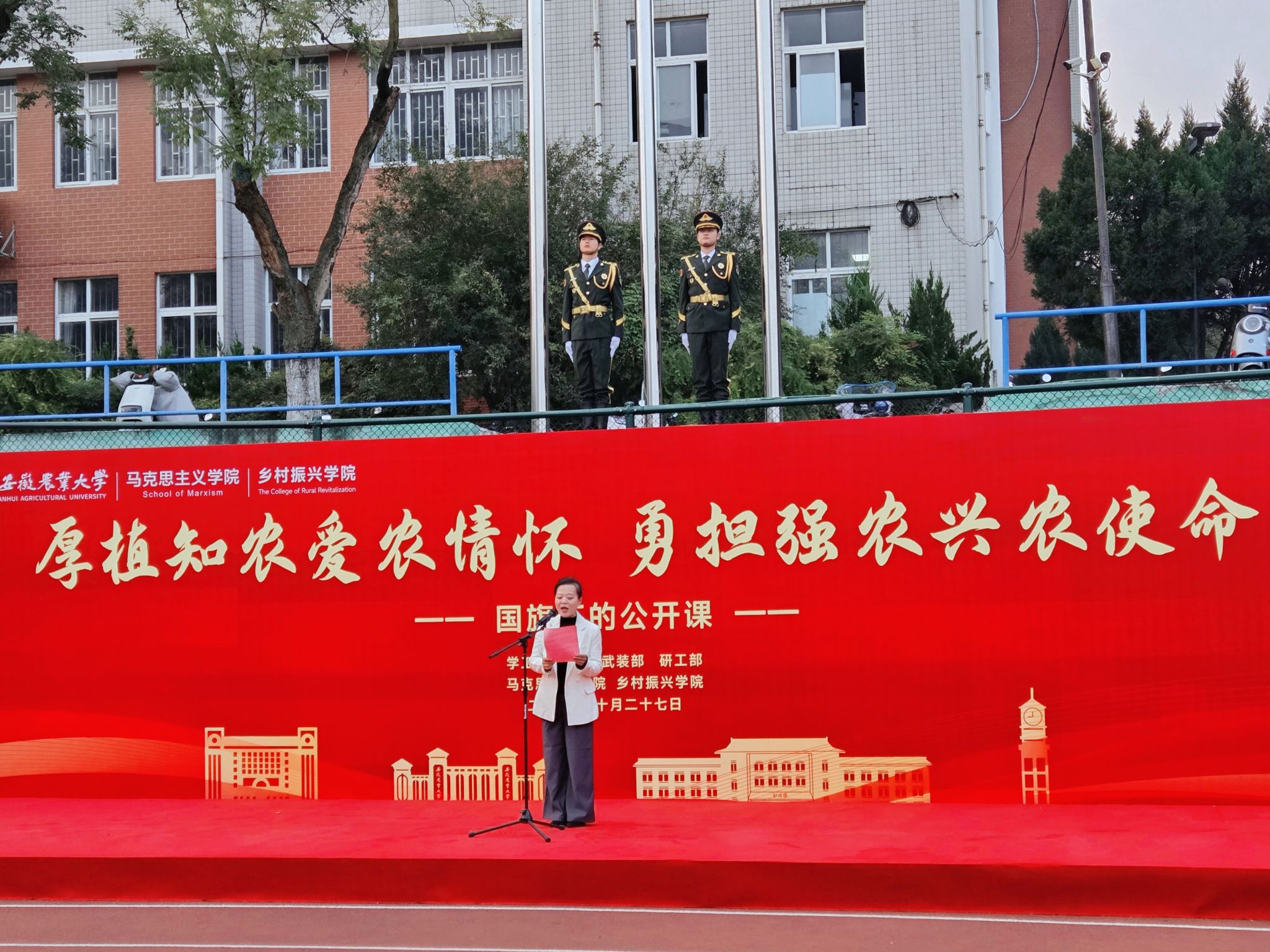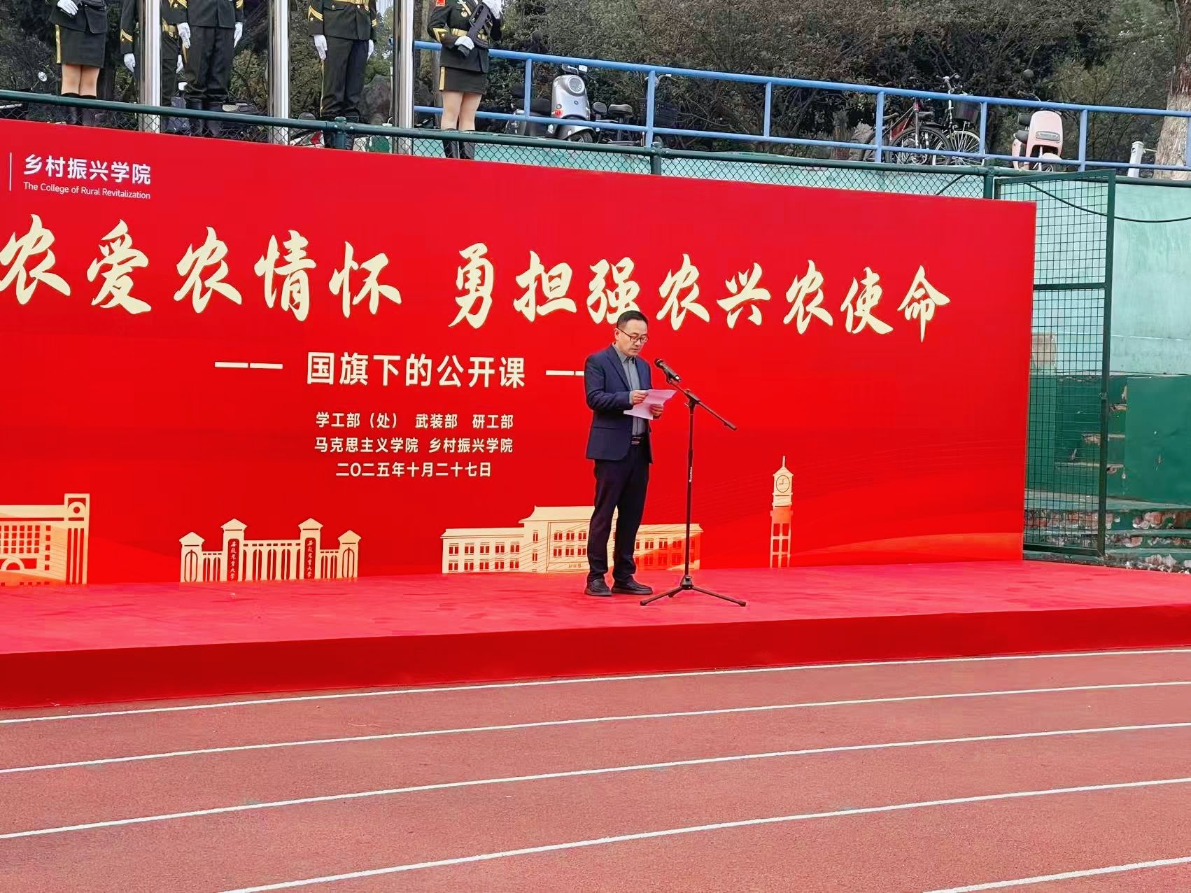 10月27日清晨,马克思主义学院与乡村振兴学院在校第一运动场联合举办“厚植知农爱农情怀,勇担强农兴农使命”国旗下公开课,以跨学院协同育人模式,将思政引领与专业教育结合,强化师生服务“三农”的使命担当。校党委常委、组织部部长、马克思主义学院党委书记韩弥明,校党委研究生工作部部长唐红萍,校学生处副处长、学生资助管理中心主任吕大鹏,马克思主义学院和乡村振兴学院领导班子成员、师生代表共同参与,活动由马克思主义学院院长苏洁主持。
